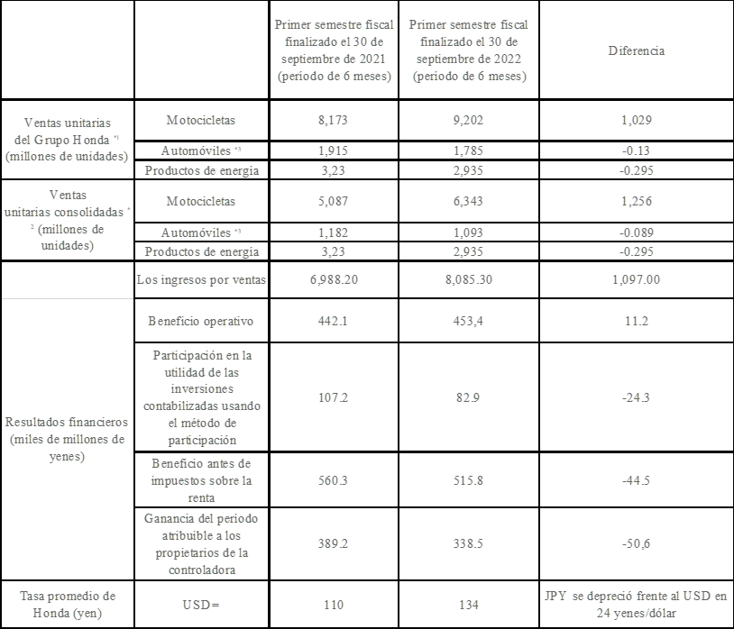 Tokio, Japón. 17 de noviembre de 2022.- Honda dio a conocer sus resultados de negocio correspondientes al primer semestre de su año fiscal (Q1 y Q2), finalizado el 30 de septiembre de 2022, cuyol beneficio operativo consolidado ascendió a $453,400 millones de yenes (3,251.7 millones de dólares), un aumento interanual de $11,200 millones de yenes ($80.3 millones de dólares). Esto se debió principalmente a la fijación de precios que refleja aumento del valor de los productos, la reducción de incentivos, el aumento de ventas de unidades de motocicletas y efectos favorables de la moneda.