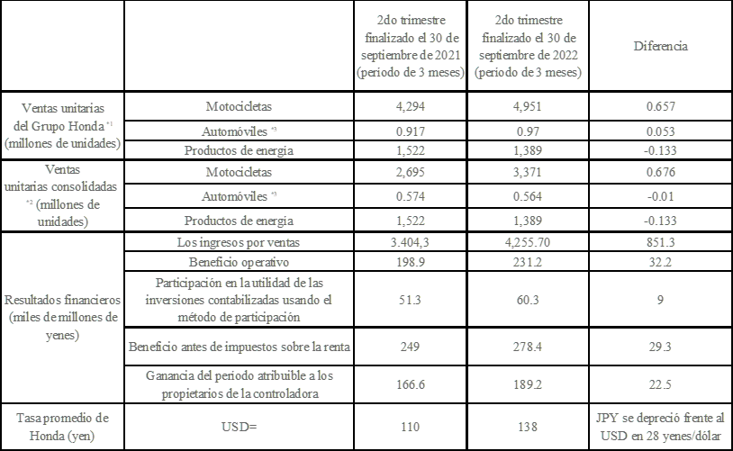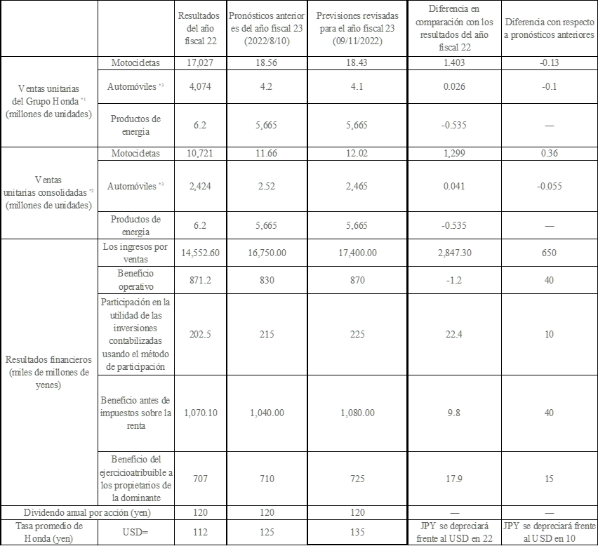 *1 Las ventas unitarias del Grupo Honda son las ventas unitarias totales de productos terminados (motocicletas, vehículos todo terreno, Side-by-Side, automóviles, productos de potencia) de Honda, sus subsidiarias consolidadas y sus afiliadas y empresas conjuntas contabilizadas utilizando el método de participación.