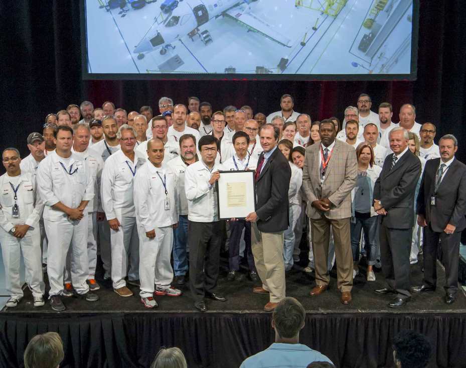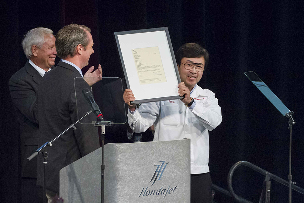 Melvin Johnson, Director de la FAA para la región central, presentó el certificado de producción entregado a Honda Aircraft Company durante una celebración especial en donde se reunieron con asociados y oficiales de la FAA el pasado 8 de julio.