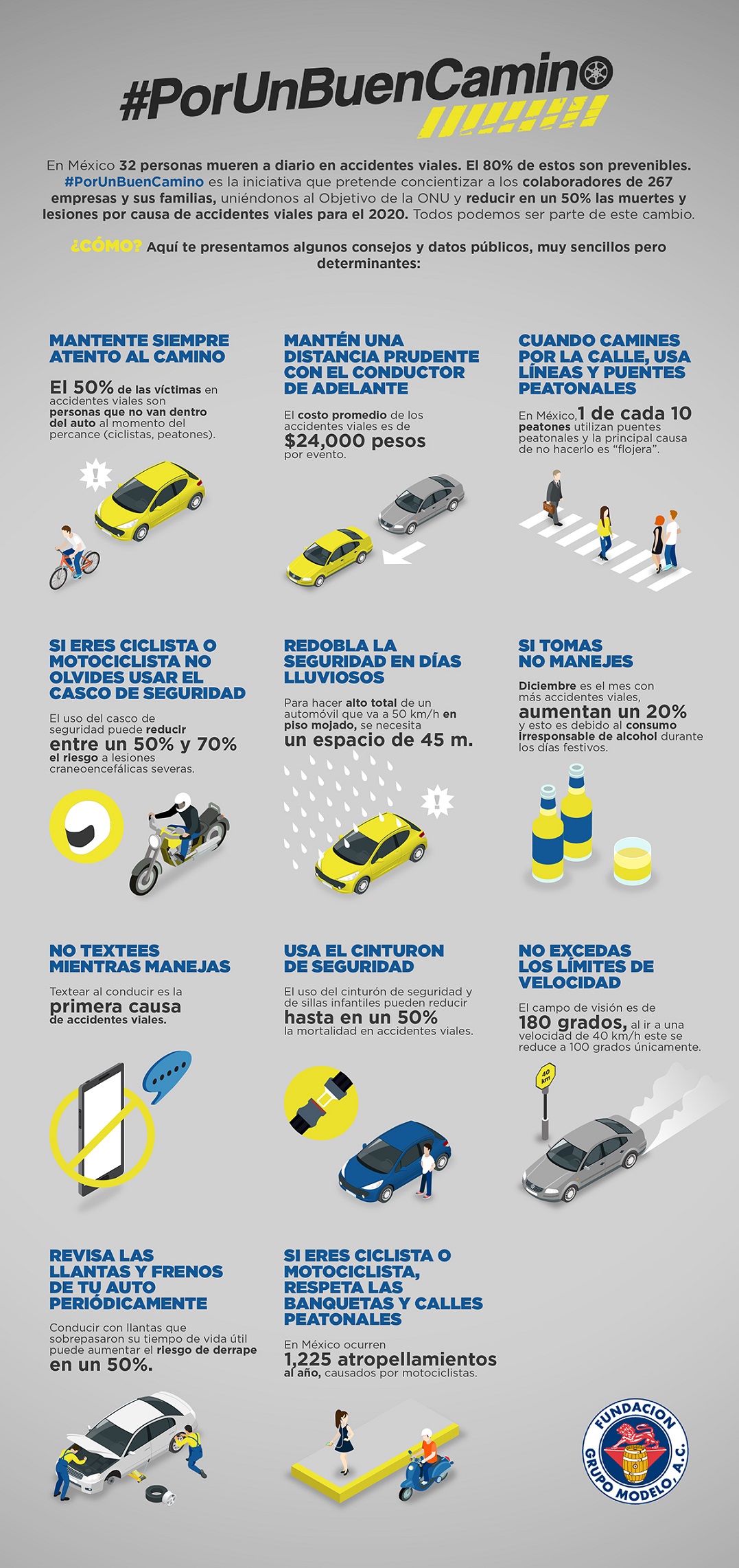La Fundación Grupo Modelo tiene ya varios años realizando varias iniciativas relacionados con seguridad vial para hacer consciencia en la sociedad con mensajes clave que permitan reducir los accidentes de tránsito, así como mejorar la movilidad impulsando la creación y fortalecimiento de alianzas sectoriales, sumando al programa universidades, gobierno, organizaciones de la sociedad civil y empresas.