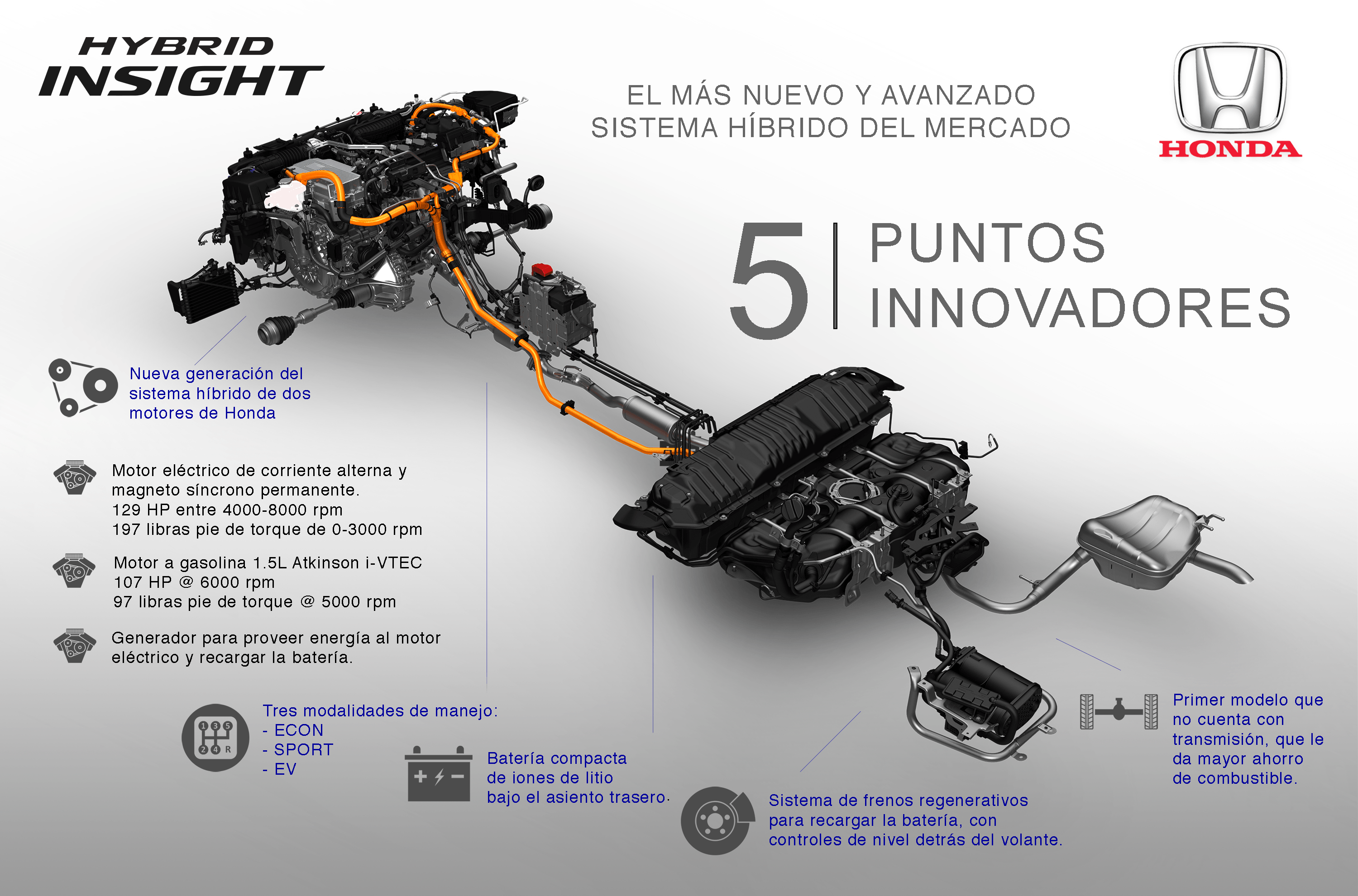 • El Insight 2019 es el primer modelo que no cuenta con una transmisión, ni de engranes ni CVT, lo que reduce la complejidad y brinda una mayor economía de combustible