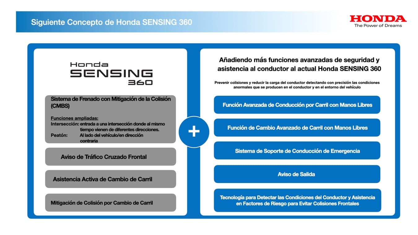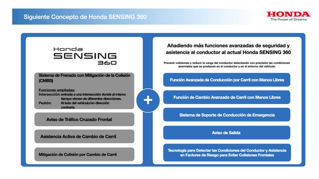 Honda SENSING 360 implementará nuevas funciones de detección de condiciones anormales que ocurren en el entorno del conductor y del vehículo para evitar colisiones. Estas nuevas funciones se agregarán al Honda SENSING 360 actual y se aplicarán secuencialmente a nivel mundial a partir de 2024.