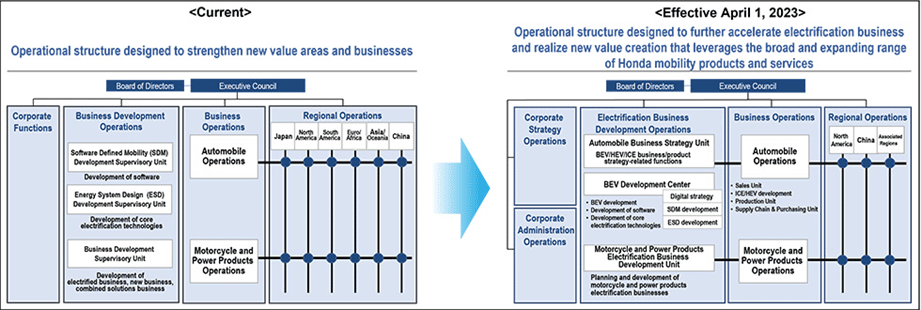 Con base en las Operaciones de Desarrollo Comercial establecidas en abril del año pasado para fortalecer el negocio de electrificación, se crearán las Operaciones de Desarrollo Comercial de Electrificación . Esta operación consolidará la estrategia comercial y las funciones de desarrollo de productos BEV del negocio de automóviles y la estrategia relacionada con la electrificación y las funciones de desarrollo de los negocios de motocicletas y productos eléctricos para fortalecer y acelerar más el negocio de electrificación de Honda.