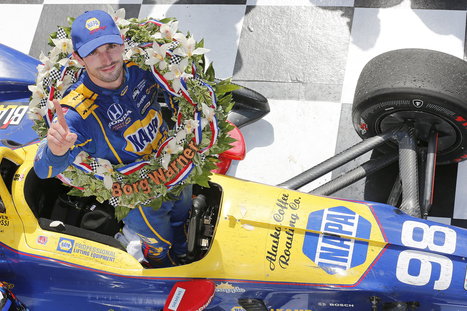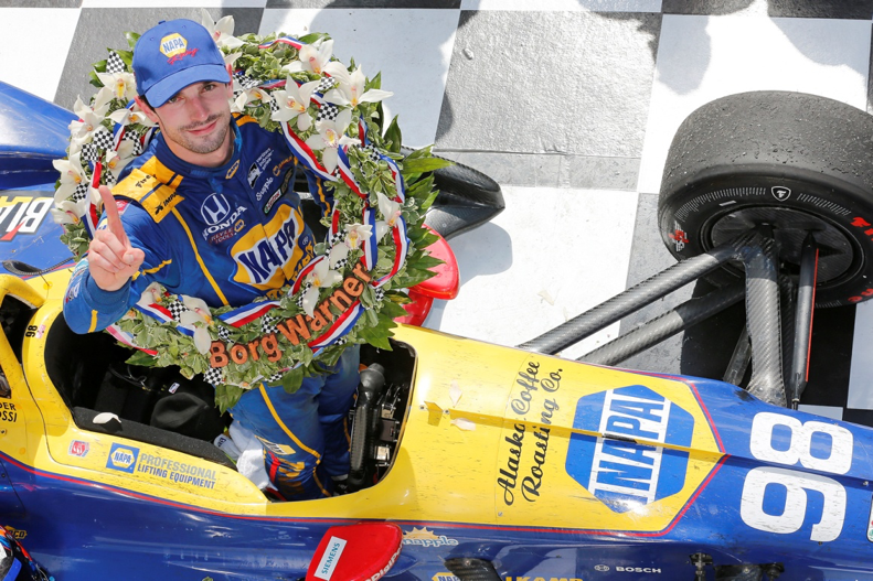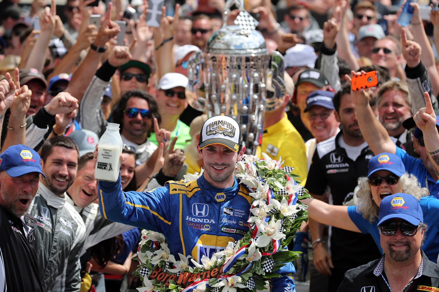 - HondaÕs Alexander Rossi celebrates his Indianapolis 500 win in Victory Circle.