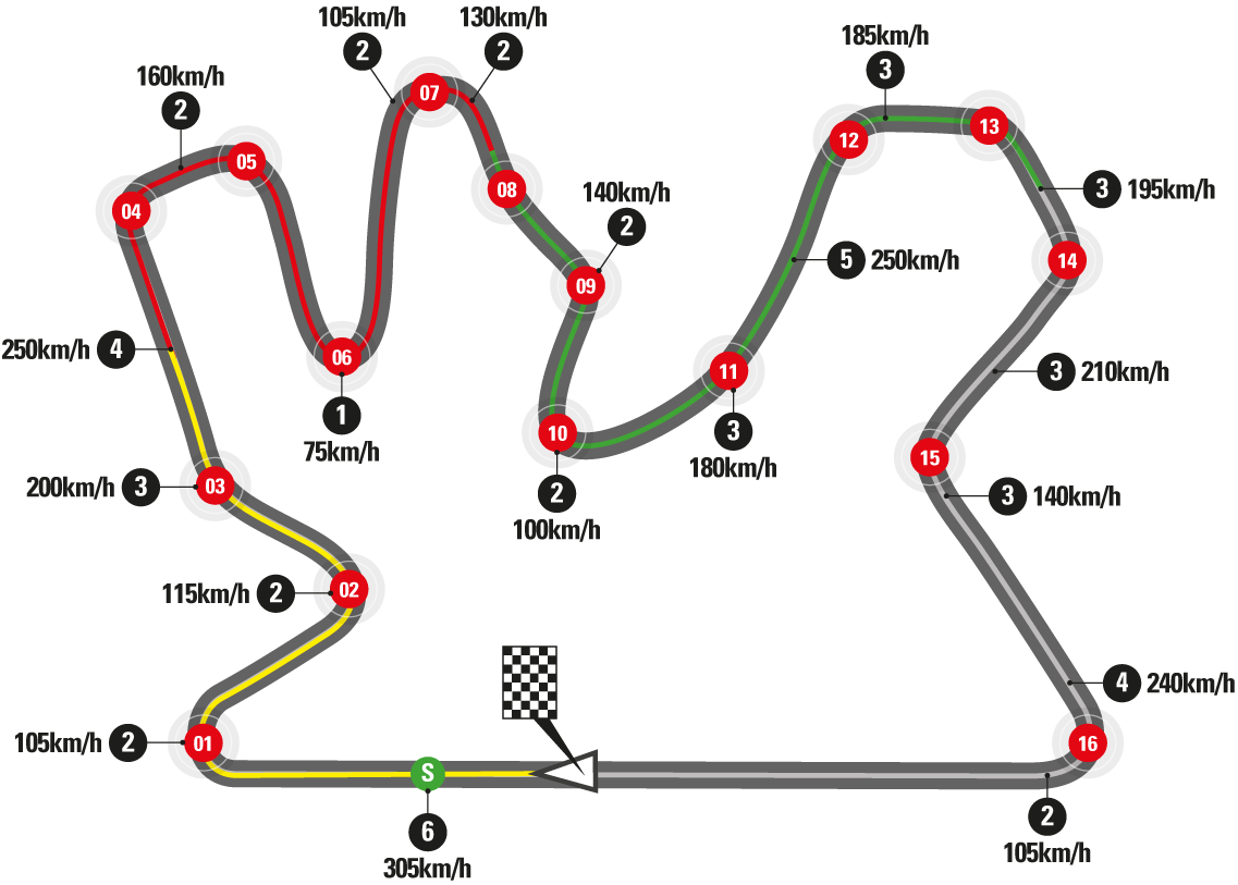 La pista tiene un diseño que fluye con 5.4 km, rodeada de pasto artificial diseñado para prevenir que la arena del desierto alrededor vuele hasta el circuito. La recta principal tiene más de un kilómetro de largo y hay una buena mezcla de curvas de media y alta velocidad, incluyendo un par a la izquierda que han sido particularmente populares con los pilotos.