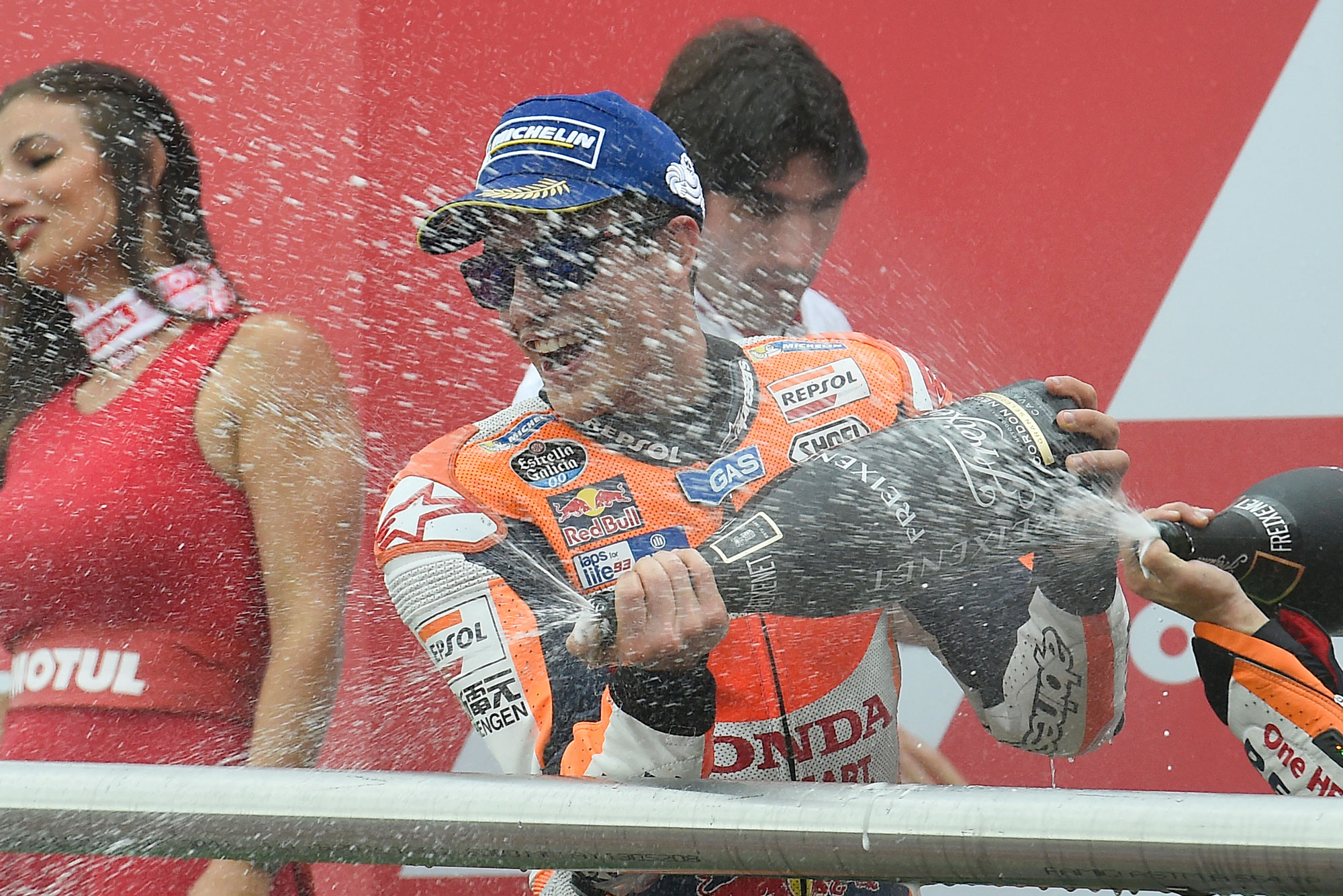 - En un fin de semana complicado para toda la parrilla, el español Márquez logró adjudicarse su primera victoria del año y su compañero de equipo cerró el podio en tercer lugar.