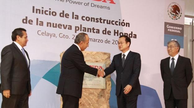 Celaya, Guanajuato, 28 de marzo, 2012— Honda de México, S.A. de C.V. (HDM) colocó la primera piedra para la construcción de su nueva planta de producción de vehículos, la cual se instalará en Celaya, Guanajuato, en un evento encabezado por el Presidente de México, Felipe Calderón Hinojosa, y el Presidente y CEO de Honda Motor Co., Ltd., Takanobu Ito. La planta comenzará su operación en el 2014 con la producción del modelo sub-compacto Honda Fit.
