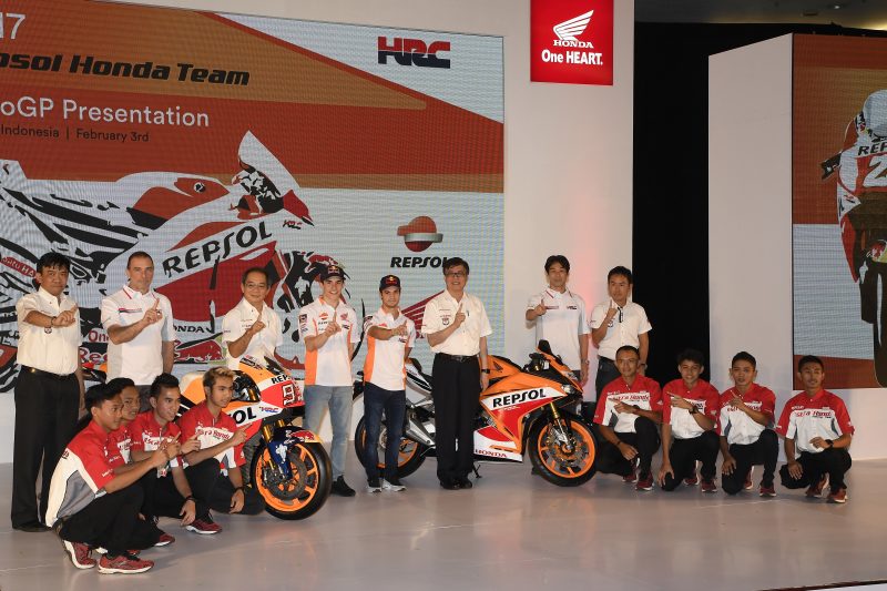 A Marc y Dani se les unieron en el escenario Tetsuhiro Kuwata (Director de HRC y gerente general de la División de Administración de Operaciones de Carreras) y el Jefe del Equipo, Livio Suppo, para la develación oficial de la moto RC213V con la que el equipo correrá el Campeonato Mundial MotoGP 2017. En el escenario también estaban ejecutivos de Astra Honda Motor incluyendo a Toshiyuki Inuma (Presidente Director), Johannes Loman (Vicepresidente Senior), Morgono Tanuwijaya (Director de Mercadotecnia) y Koji Sugita (Director de Mercadotecnia). Se firmó un contrato de asociación por parte del Sr. Kuwata, el Sr. Inuma y el Sr. Loman.